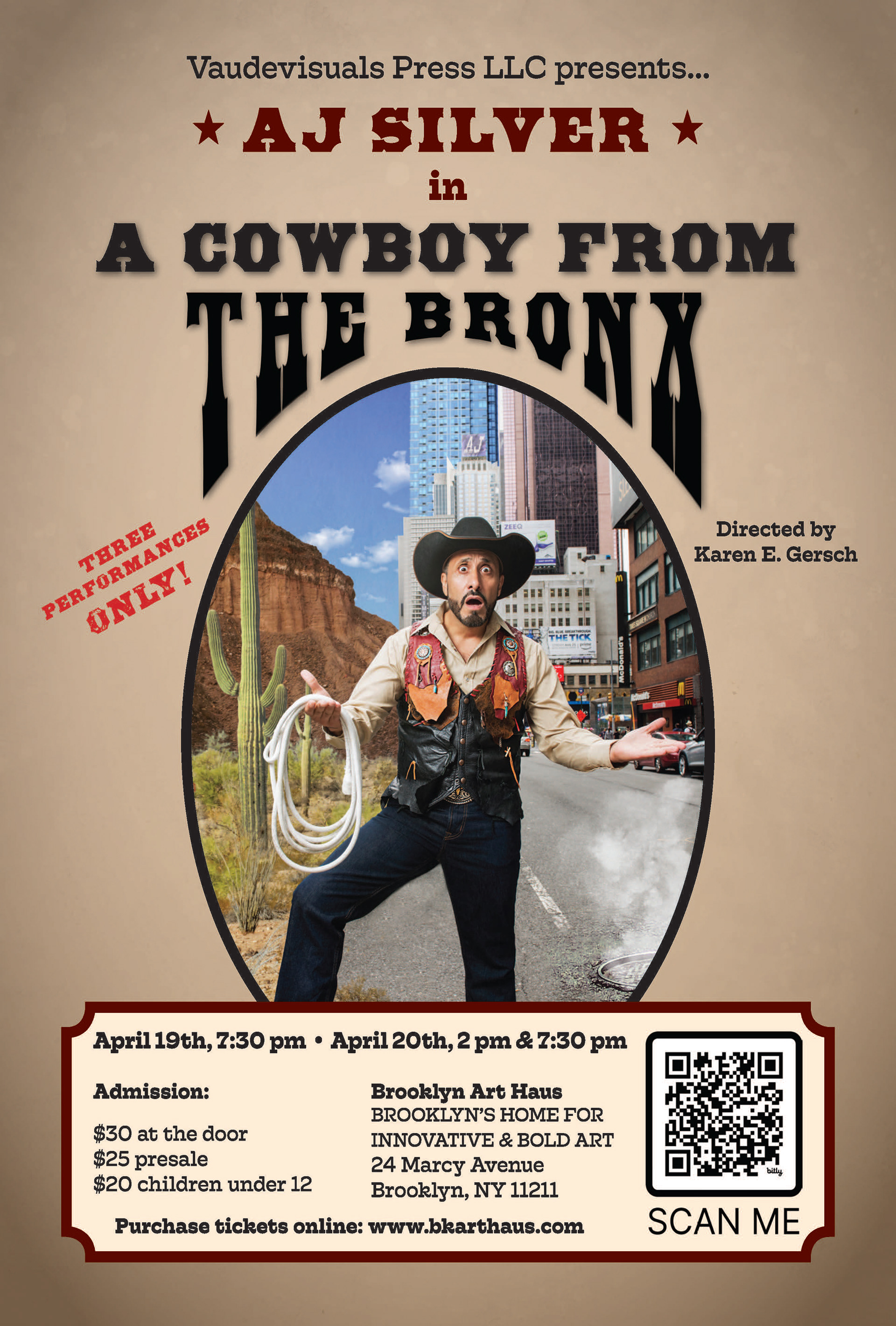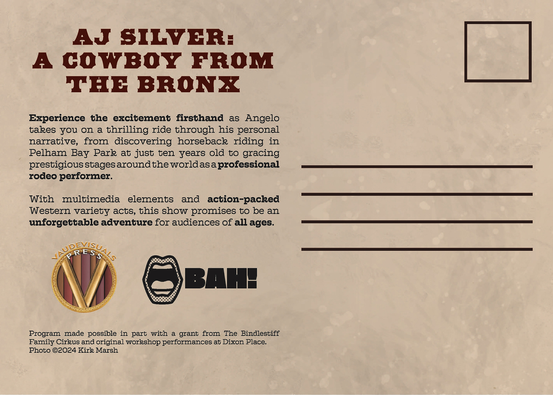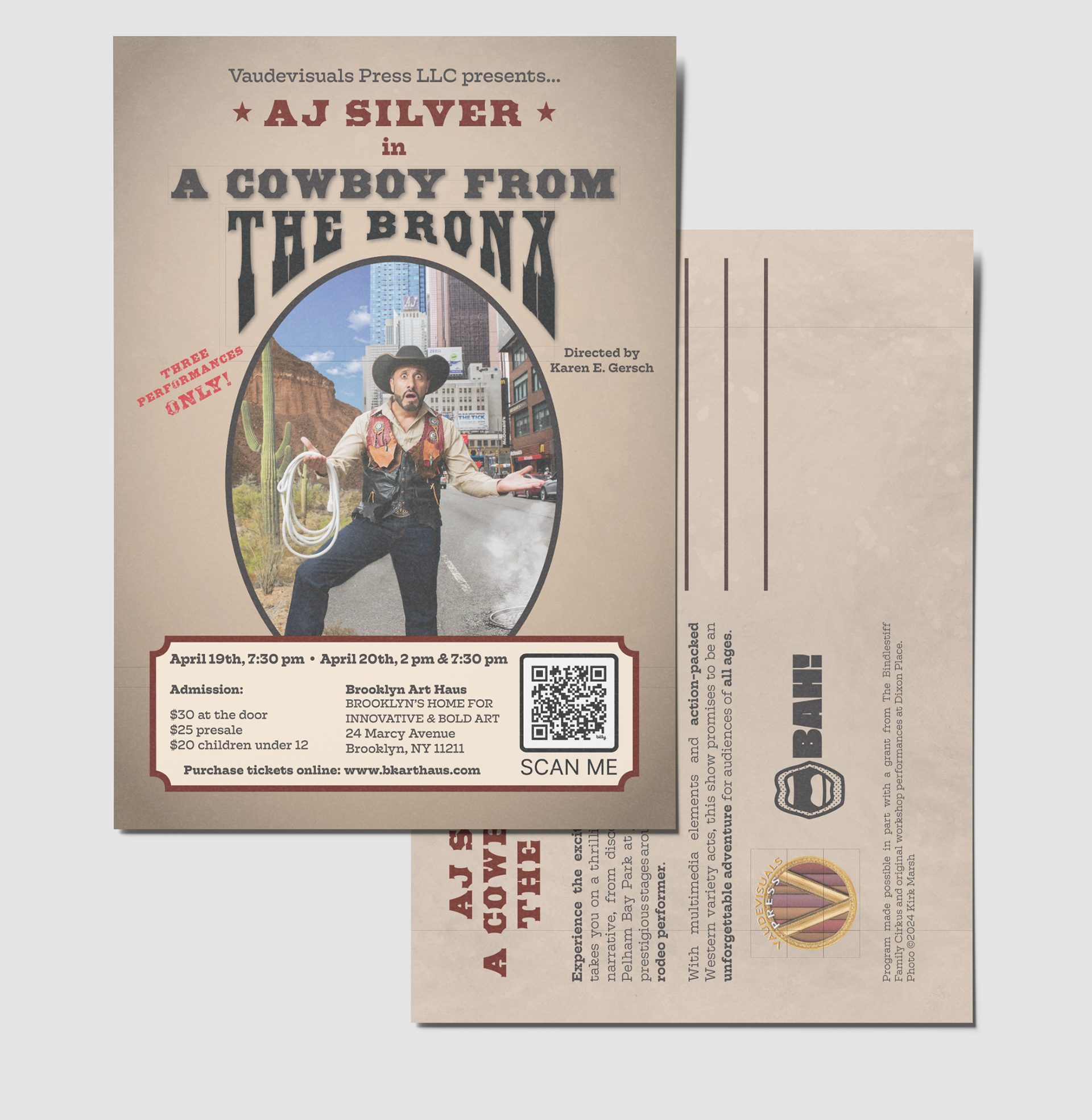 I designed this show postcard in Indesign with customized lettering, color palette, and visual details to fit the western theme of the show it was advertising.