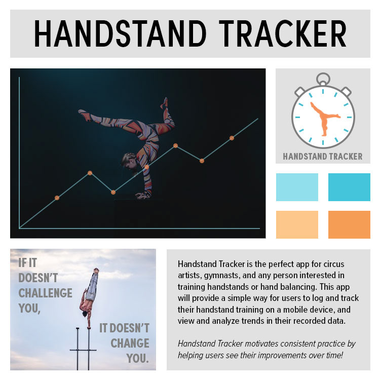 Handstand Tracker App is a fictional mobile app that would allow users to log and track their handstand training on a mobile device. This project was created for an Adobe Photoshop class in Fall 2021.